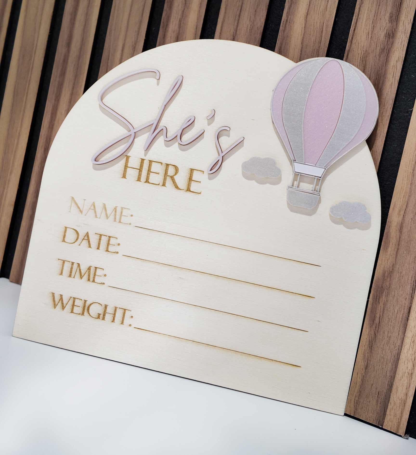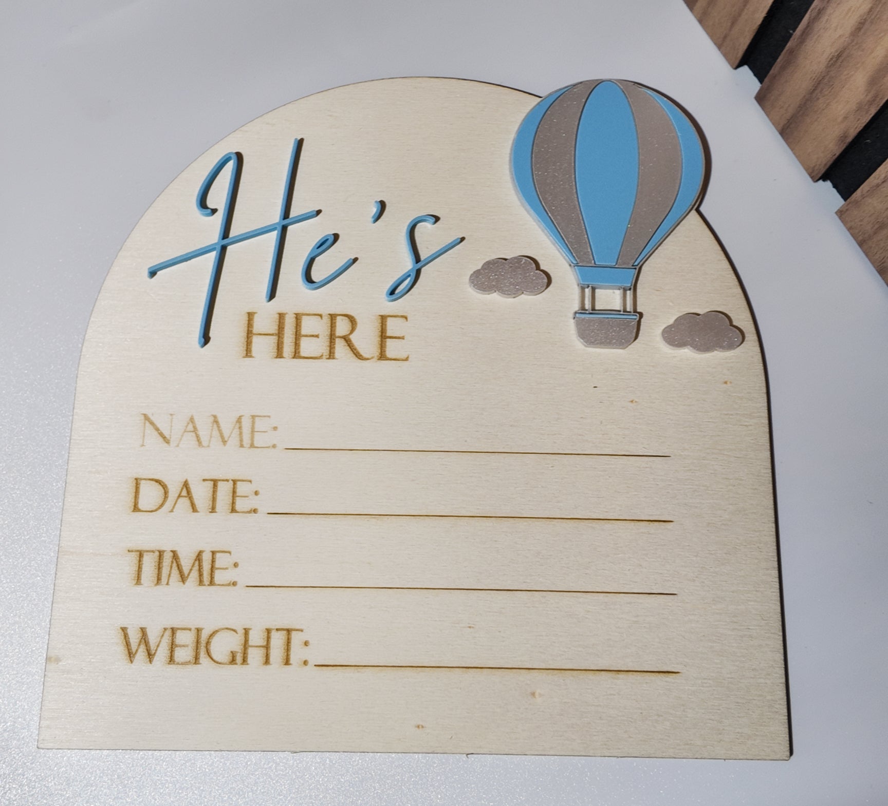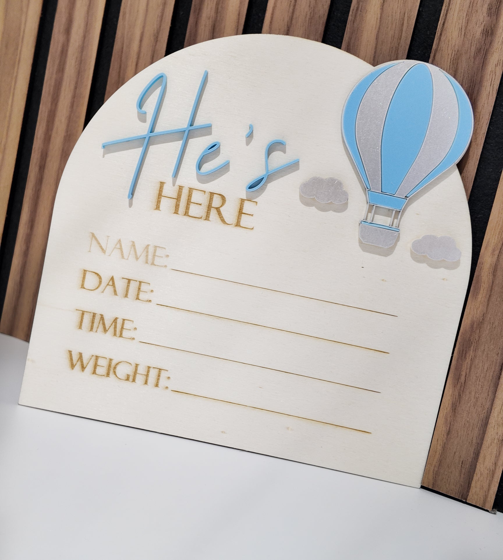 The “He’s” / “She’s” lettering and the hot air balloon are made from high-quality acrylic, giving the design a beautiful 3D effect. The remaining elements—including “HERE” and the personalized fields—are finely laser-engraved into the wood for a clean and timeless look.