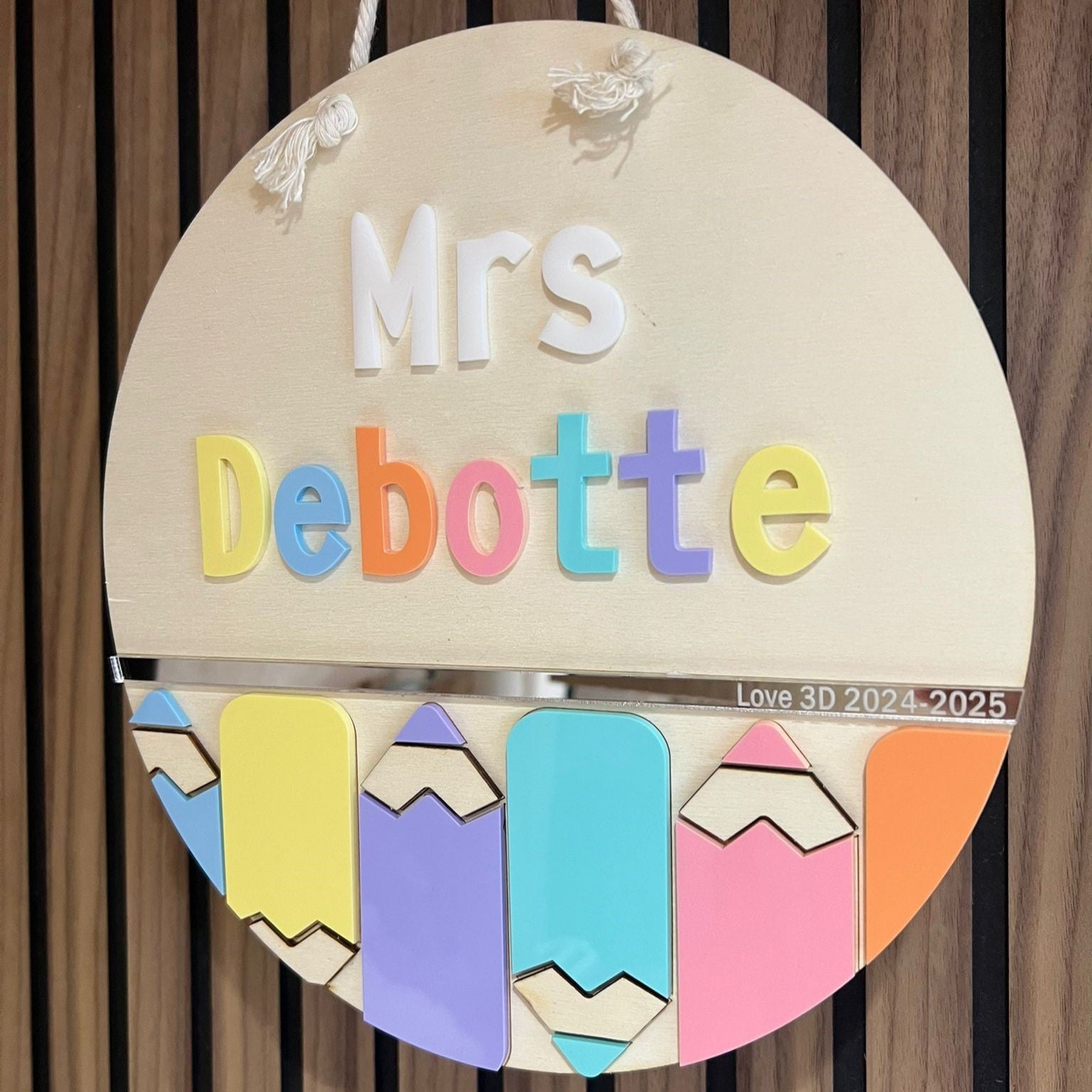 Perfect as a thank-you gift for teachers, a back-to-school surprise, or a unique classroom decoration, this sign features the teacher’s name in eye-catching 3D letters and fun pastel pencil designs. A sleek acrylic strip along the bottom can be customised with a class name or message (e.g., Love 3D 2024–2025), making it a meaningful keepsake they’ll treasure for years.