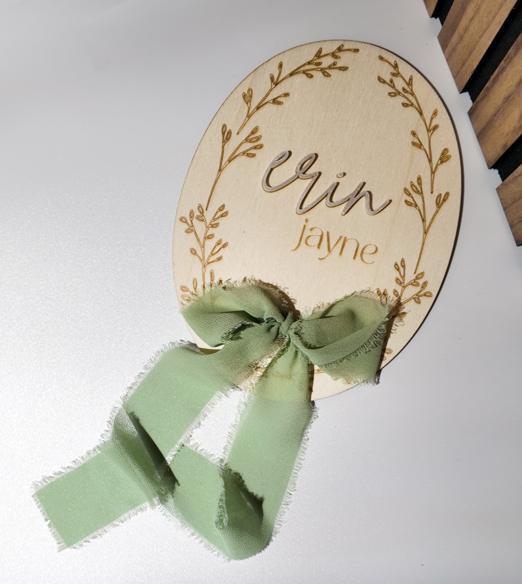 The first name (like Erin) pops in raised acrylic for that eye-catching 3D look, while the middle name is engraved right into the natural wood. A whimsical botanical border adds that extra magic touch — and the best part? You get to pick your favorite ribbon color to match your nursery, photo theme, or just because it's cute.